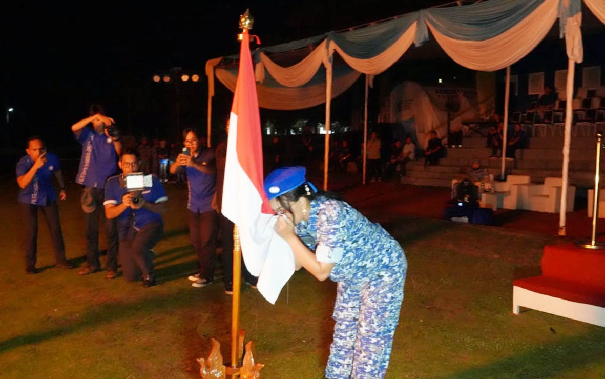 Prosesi dilanjutkan dengan penciuman bendera Bela Negara dan penyalaan api unggun,