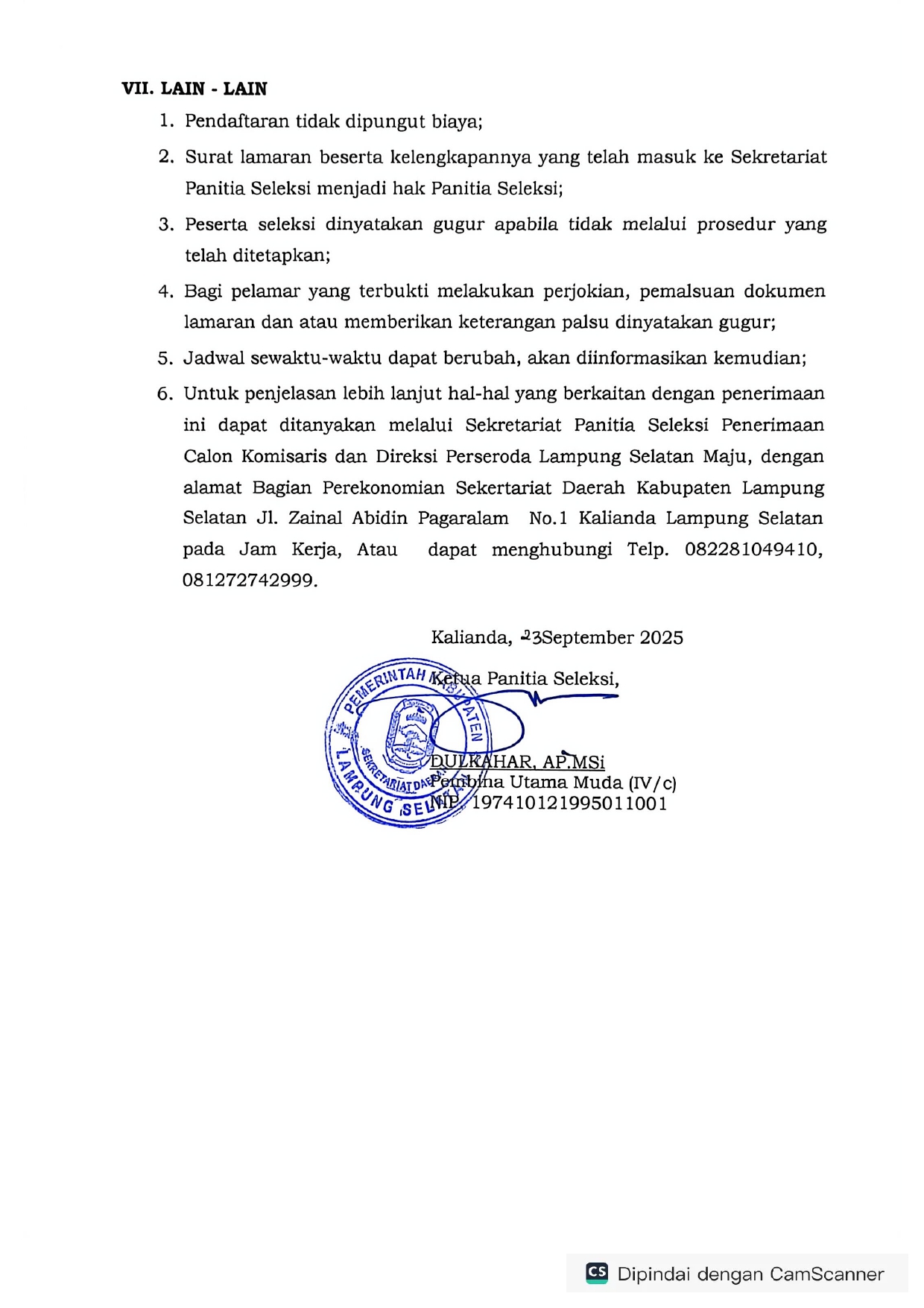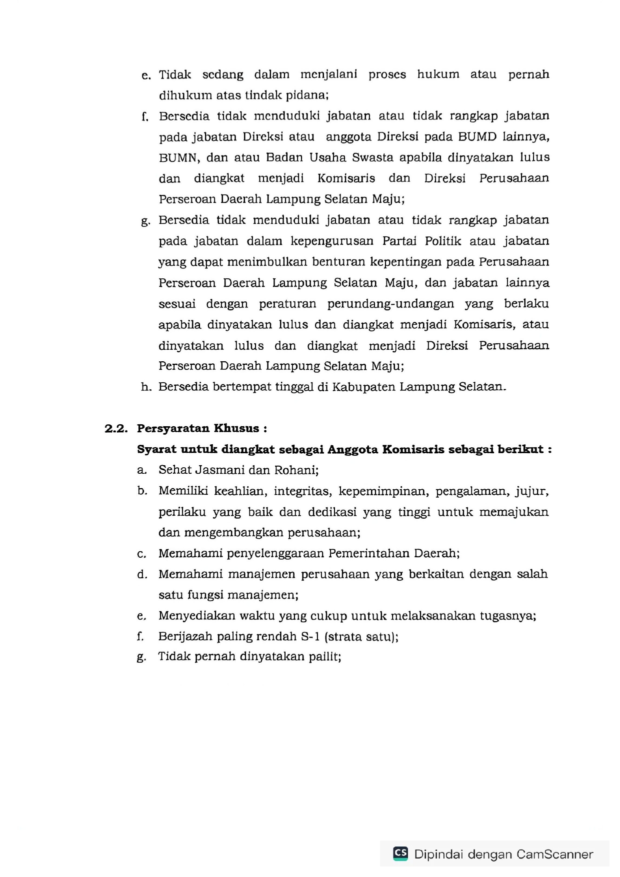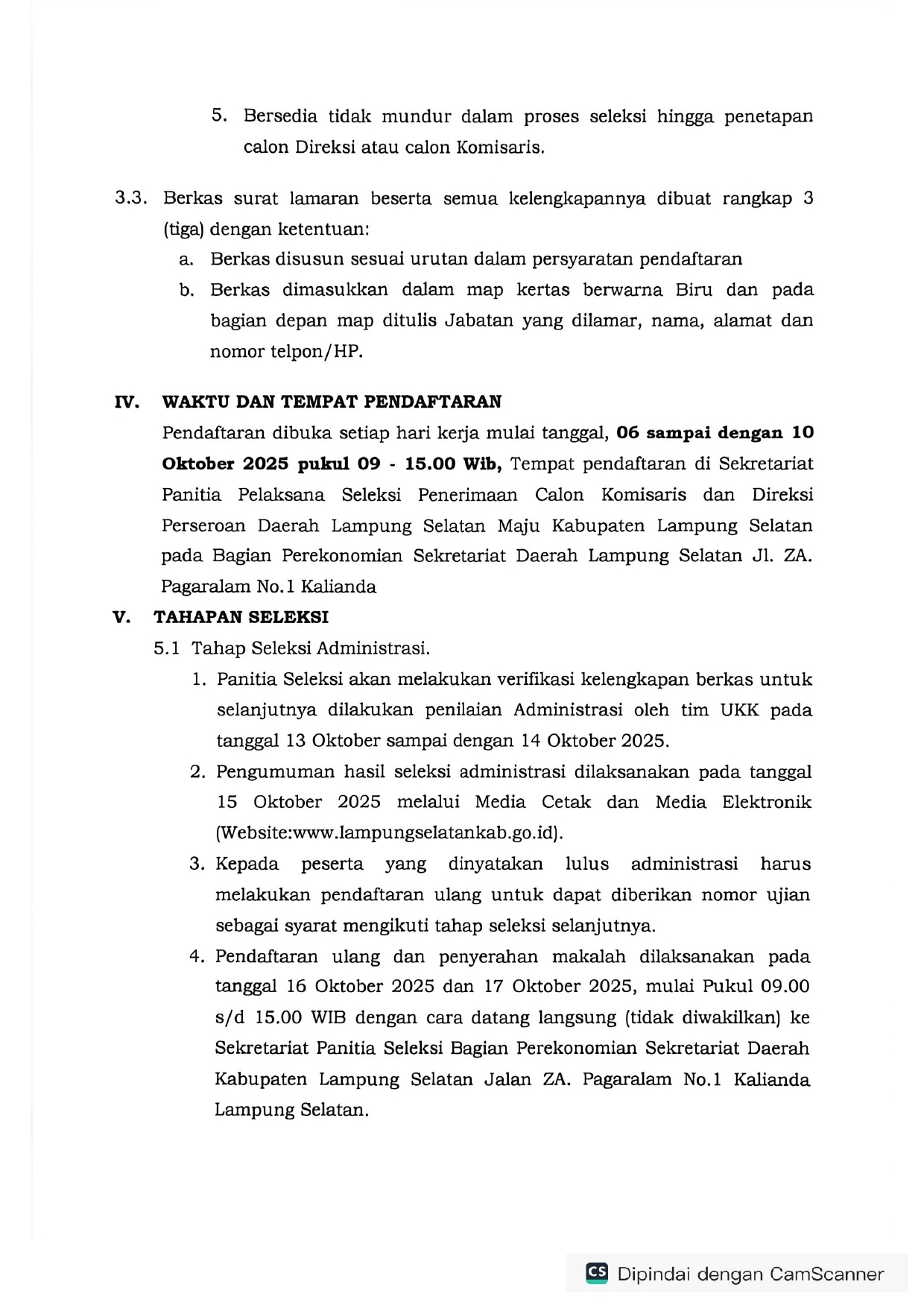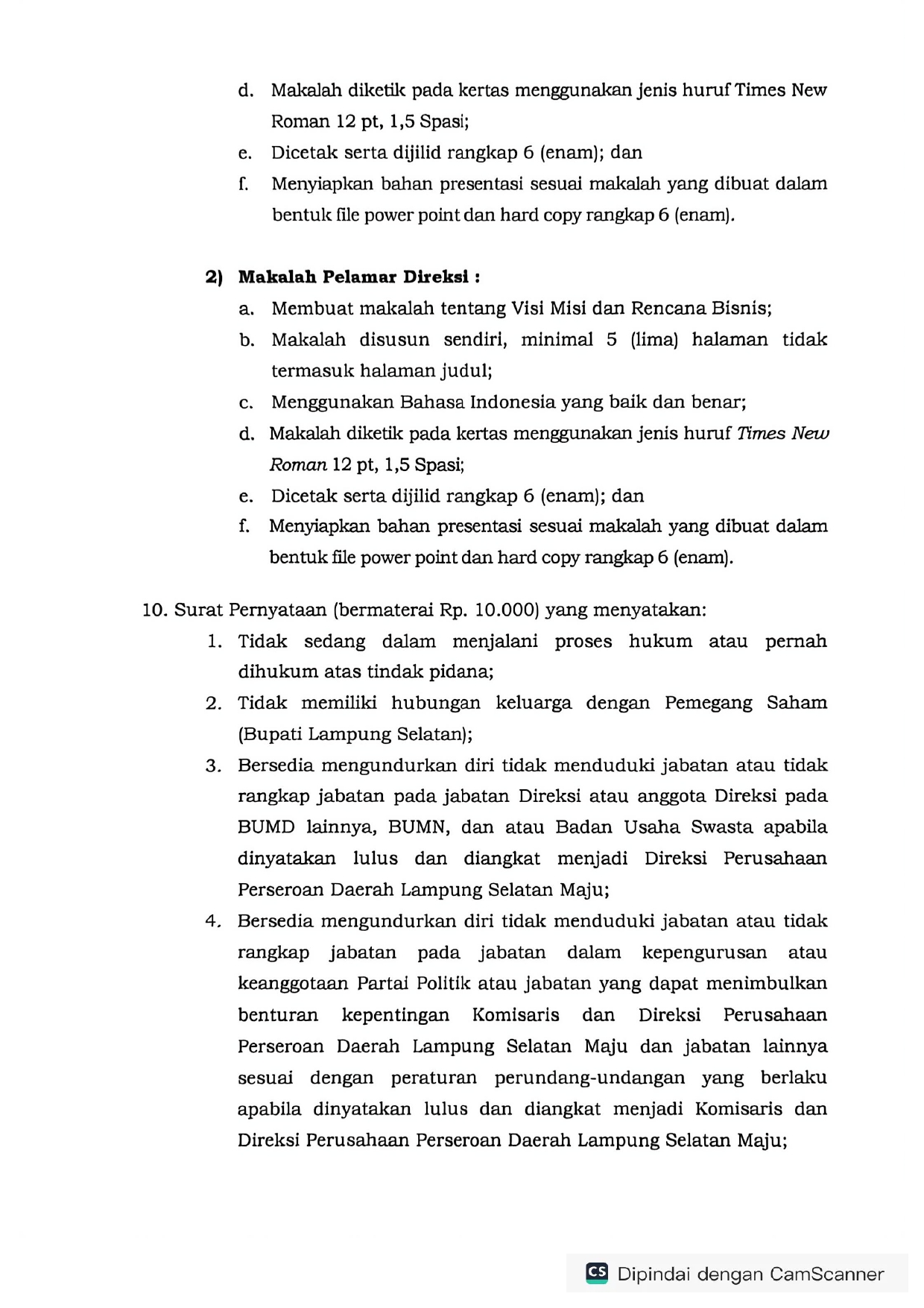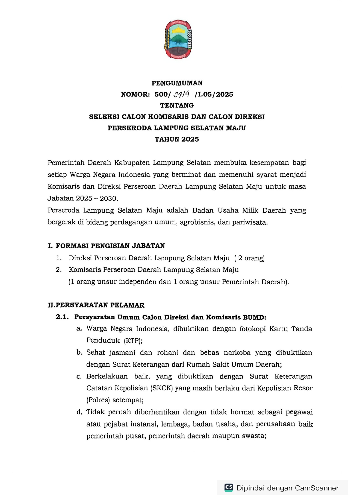 PENGUMUMAN SELEKSI CALON KOMISARIS DAN DIREKSI PERSERODA LAMPUNG SELATAN MAJU