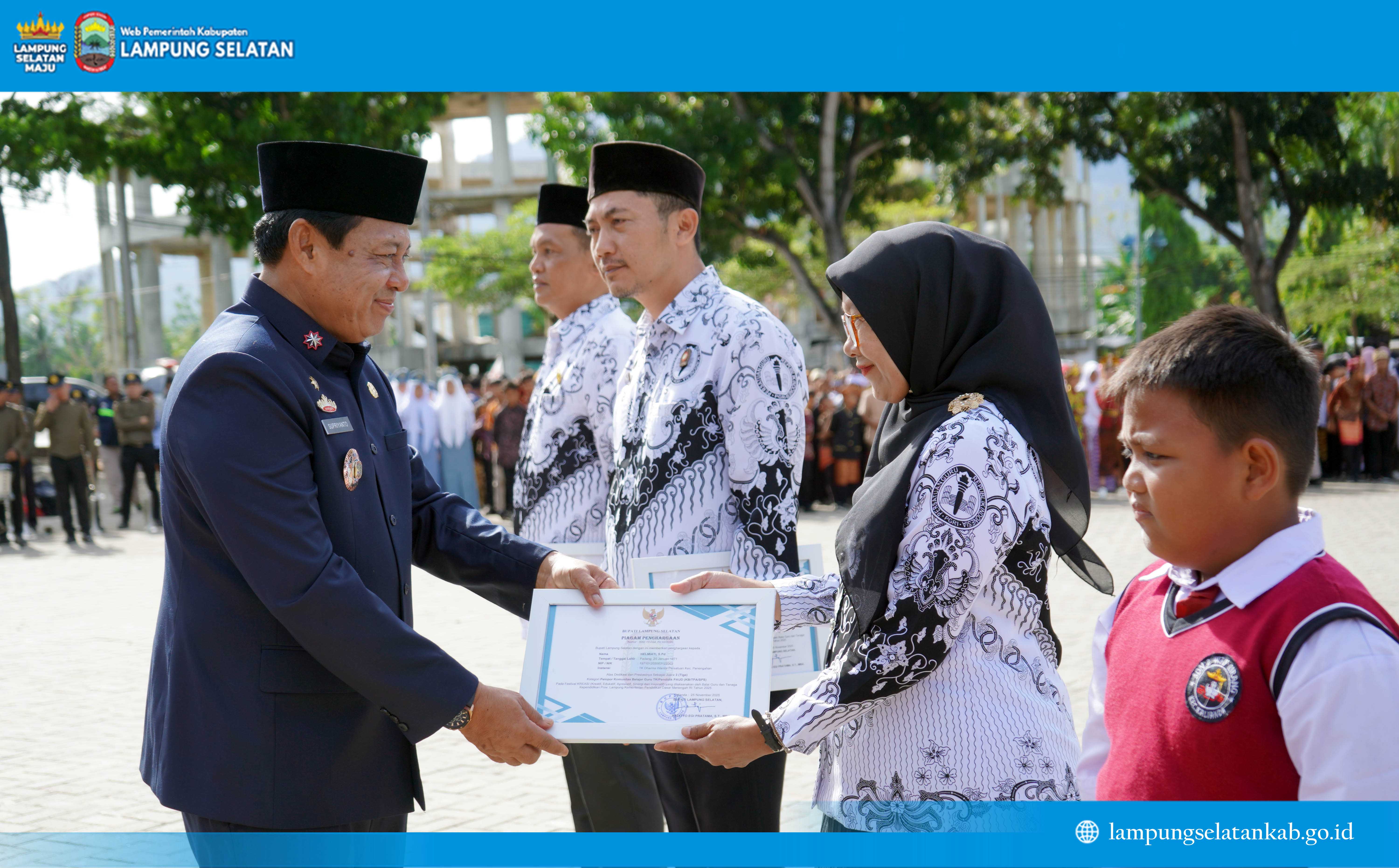 Pemerintah Kabupaten Lampung Selatan bersama PGRI juga menyerahkan piagam penghargaan kepada para guru dan kepala sekolah berprestasi pada Festival KREASI Balai Guru dan Tenaga Kependidikan Provinsi Lampung 2025. Penghargaan ini menjadi pengingat bahwa profesi guru terus berkembang dan dituntut adaptif terhadap perubahan.